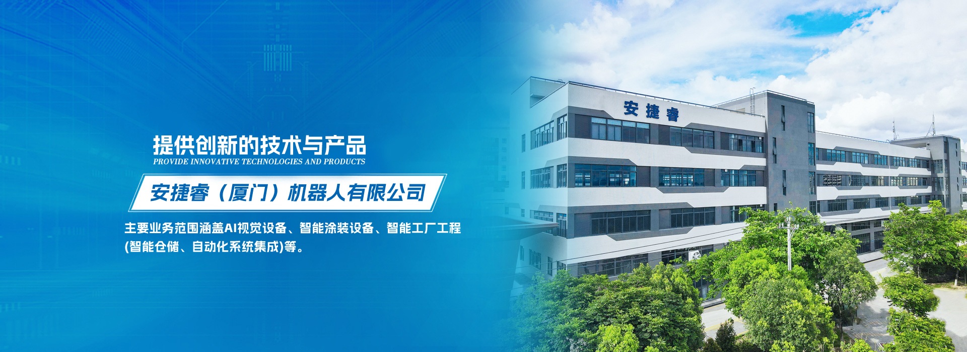 安捷睿(廈門)機器人有限公司坐落于美麗的經濟特區廈門,是專業從事智能機械、機器人設備研發、生產和銷售的國家級高新技術企業。 安捷睿著力服務高端制造業,主要業務范圍涵蓋AI視覺設備、智能涂裝設備、智能工廠工程(智能倉儲、自動化系統集成)等。公司與清華大學、哈爾濱工業大學、東北大學、廈門大學等高校緊密協作,且有多項技術成果轉化。公司致力于解放勞動力,為實現無人化生產提供創新的技術與產品,與合作伙伴共享科技發展成果。